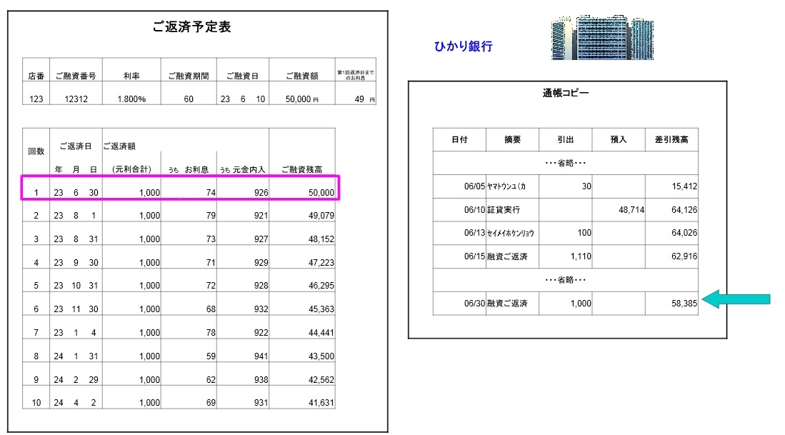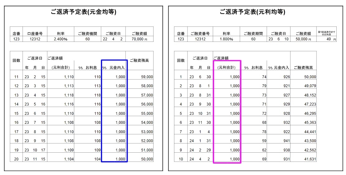 はじめ君 : 先輩、ちょっと質問があるのですが・・・ 2つの返済予定表をみると、1つは元金が毎月1,000円、 もうひとつは返済額が毎月1,000円。同じ借入金でも返済方法が違うんですね。